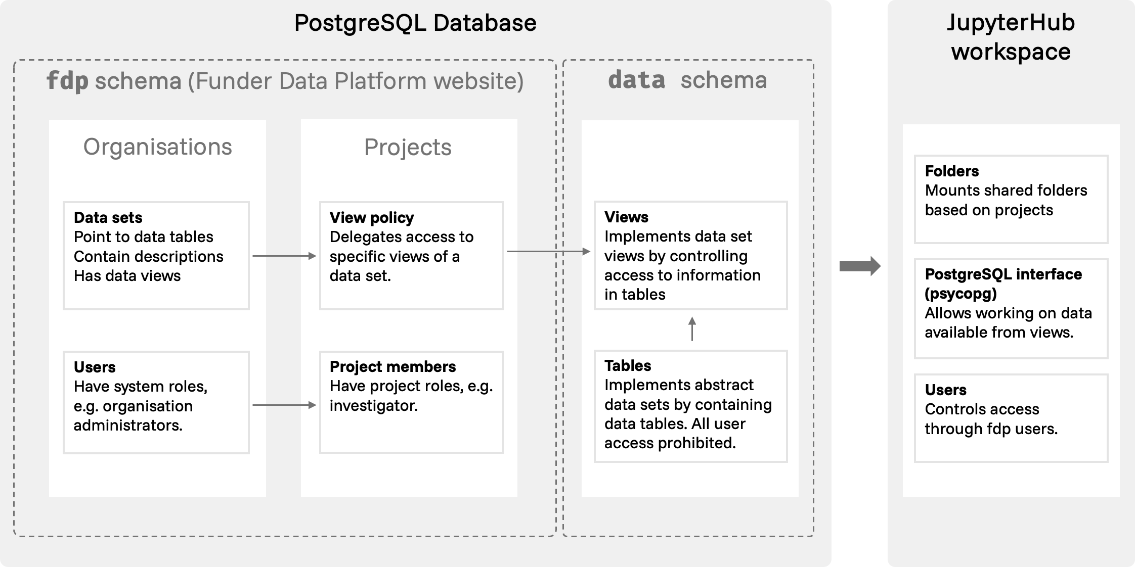 fdp- contains administrative and metadata (e.g. users, organisations, collaboration agreements, and data policies)data- contains the actual research data tables and their associated access views